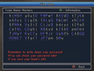 To know you team password first you have to register your team from save file. Load data then edit the team. Next choose to view your team. Press triangle to view your team password. If you give your team password to another player he will be able to load your team in his game.