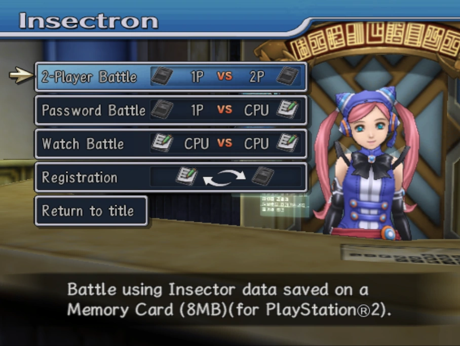 You can participate in head-to-head matches by choosing the Insectron option from the menu at the title screen. However, first, you'll need to clear Rank D at the Insectron Championship. Once you have cleared Rank D save your game and reset. At the title menu choose the Insectron option. First thing is to register your team. You can either register from "password" or save file. It's easy to understand that from save file you load your Insectron team from the main game. The password option is different. Choosing this mode will prompt you to input 118 characters (alphanumeric). A correct input will load a whole team with their name, level, stats, positions. You can obtain such input from other players such as your friends. An example: